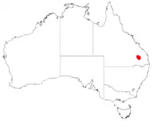 It is endemic to a small area to the north of Chinchilla within the Barakula State Forest, where it grows in sandy or pale loamy-sandy soils over sandstone as a part of Eucalyptus woodland communities.[1] It is found in a similar habitat as Acacia gittinsii consisting of tall shrubland or shrubby woodland with other species of Acacia as well as Eucalyptus tenuipes, Corymbia trachyphloia and Triodia mitchellii.[2]