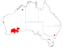 It is native to an area in the eastern Wheatbelt and Goldfields-Esperance regions of Western Australia where it is found in low-lying areas, on sandplains and dunes growing in sandy or clay soils.[1] The range extends from Newdegate in the west to around Balladonia in the east and is often part of mallee or Eucalyptus woodland communities.[2]