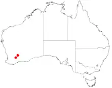 It is native to an area of the Wheatbelt and the Goldfields-Esperance regions of Western Australia between Kondinin and Yilgarn where it is found on lateritic flats and hills growing in red to brown loam-clay soils[1] as a part of open Eucalyptus woodland or mallee shrubland communities.[2]