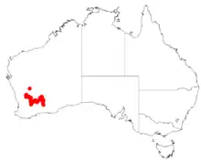 It is native to an area in the Goldfields-Esperance and the Wheatbelt regions of Western Australia where it is commonly situated on low rises and plains growing in gravelly sandy soils.[1] The range of the shrub extends from around Muntadgin in the west to as far east as Coolgardie with at least one outlying population found around Wialki much further to the north where it is usually a part of scrub or heath communities.[2]