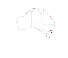 The shrub has a limited distribution about 20 km (12 mi) south of Eden in south western New South Wales with the bulk of the population confined to the Nadgee State Forest and within the boundaries of the proposed Narrabarba Hill Flora Reserve over a range of about 3 km (1.9 mi). Another smaller population in situated in Beowa National Park. The species is found on rocky rhyolite and apatite ridge-tops with nutrient poor skeletal sandy soils but sometimes in brown to black loamy soils. The estimated population is about 6,000 individuals in an area of around 4 ha (9.9 acres).[1]