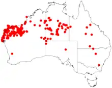 Acacia coriacea occurs throughout northern Australia, growing as a tall tree on the banks of rivers. It can also occur as a spreading, low tree behind coastal dunes and on 'spinifex' plains.[3]