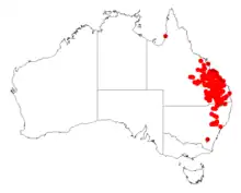 Its range follows along the line of the Great Dividing Range from around Mackay in Queensland to about Newcastle in New South Wales[2] where it is found on sandstone and rocky conglomerate areas growing in gravelly, sandy, sandy loam or clayey soils. It is usually a part of sclerophyll woodland, heath or open scrub communities.[1]