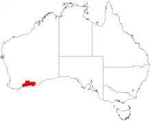 It is native to an area in the Goldfields-Esperance region of Western Australia where it is commonly found growing in clay loam soils often containing lateritic gravel.[1] The range of the species is from around Ravensthorpe in the west to around Kundip in the south and out to Munglinup in the east and also Scaddan–Wittenoom Hills area as a part of open scrubland communities.[2]