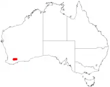 It is native to an area in the Wheatbelt region of Western Australia where it is commonly situated on low rocky hills and rises where it grows in gravelly lateritic soils.[3] It has a limited distribution around Lake Grace as a part of low shrubland or open heath communities.[4]