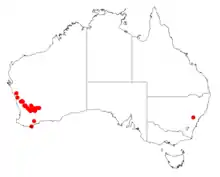 It is native to an area in the Wheatbelt region of Western Australia from around Coorow in the north west to around Southern Cross in the south west and has a scattered distribution. It is found on sand plains growing in gravelly to sandy soils around laterite[1] as a part of shrubland communities.[2]