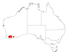 It is native to an area in the Wheatbelt and Great Southern regions of Western Australia where it is commonly situated on slopes and undulating plains growing in gravelly loamy lateritic soils.[1] The range of the plant extends from around Kukerin in the north to around Kojonup in the south west and Brommehill in the south east.[2]