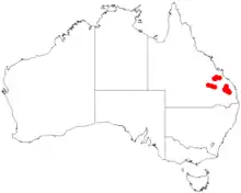 The shrub has a limited distribution in south eastern Queensland from around Taroom in the south and up to around Duaringa in the north.[1]