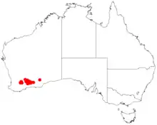 It is native to an area in the Wheatbelt and Goldfields-Esperance regions of Western Australia where it is found growing in sandy or loamy soils.[3] It is found from around Kulin in the west to around Lake Gilmore in the east.[1]