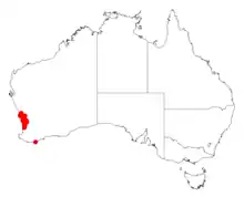 It is native to an area along the west coast in the Wheatbelt and Peel regions of Western Australia where they are often situated in lateritic soils.[1] The bulk of the population is found from around Mount Lesueur in the north down to around Kalamunda in the south and also from around Serpentine and Watheroo where it is found in loamy soils in as a part of Eucalyptus wandoo woodlands or loamy gravelly soils in low heath communities.[2]