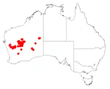 It is native to an area in the Mid West, Wheatbelt and Goldfields regions of Western Australia.[1] It has a scattered distribution with the bulk of the population found from around Yalgoo in the west to the Carnarvon Range in the north east to around Leinster in the east. Outlying populations are located in the Gibson and Great Victoria Deserts. It is often situated on sand dunes and plains growing in a variety of soil types usually as a part of tall open shrubland communities and it is often associated with spinifex.[2]