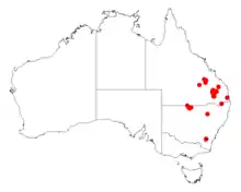 The shrub has a wide distribution through south eastern Queensland and central New South Wales.[2] It is commonly situated on sand-plains growing in sandy soils as a part of spinifex communities.[1]