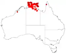 It is found in the following bioregions of the Northern Territory: Arnhem Coast, Arnhem Plateau, Central Arnhem, Daly Basin, Darwin Coastal, Gulf Fall and Uplands, Pine Creek, Sturt Plateau, Tiwi Cobourg, and Victoria Bonaparte.[1]
