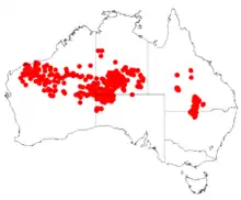 Acacia maitlandii is found in northern regions of all mainland states of Australia, except Victoria,[3] and is not considered to be threatened with extinction.[2] The favoured soil type is red sand, or stony ground; the habitat is sandy or stony plains, and on hills.[2]