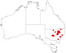 It is found in central New South Wales on the eastern side of the Great Dividing Range from around Hillston and Katoomba in the south to around the Hunter Valley in the east mostly on the slopes and often in the Pilliga Scrub. It is often a part of dry sclerophyll woodland and mallee communities growing in sandy soils.[1]