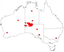 A. olgana has a scattered distribution from the far east of central Western Australia in the Goldfields region[2] into the south of the Northern Territory and north western South Australia.[4][1]