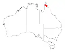 The shrub has a limited range in far north Queensland on the Cape York Peninsula around Weipa where it grows in gravelly ironstone soils.[1]