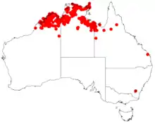 It is native to a large area in the Northern Territory and the Kimberley region of Western Australia where it is found to grow in a variety of habitats.[1]