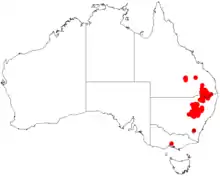 It is endemic from south eastern Queensland from the southern portion of the Darling Downs district and the range extends south to the central western slopes and north western plains of New South Wales as far south as Munghorn Gap Nature Reserve where it is found in a variety of habitat growing in infertile rocky, sandy or gravelly clay soils as a part of open Eucalyptus woodlands or in shrubland communities.[1]