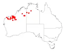 It is native to the Pilbara, southern Kimberley and far northern Goldfields regions of Western Australia where it is found growing in stony soils and gritty alluvium and is often found along creek beds and on rocky hills.[1] The disjunct distribution extends into the top end of the Northern Territory to around the Hooker Creek area where it is often situated on sand plains or rocky slopes as a part of spinifex communities.[2]