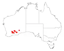 It is native to an area in the Wheatbelt and Goldfields-Esperance regions of Western Australia where it is often situated on flats and low hills growing in rocky calcareous loamy or sandy soils.[1] It has a scattered distribution from around the Parker Range in the west to around Kanandah Station in the east where it is often found as a part of open Eucalyptus woodland communities.[2]