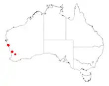 It has a disjunct and scattered distribution through the Wheatbelt and Mid West regions of Western Australia where it is found growing in clay, loamy or sandy soils.[1] The range of the plant extends from the Murchison River in the north down to Northampton in the south with another population found further south near Mogumber Nature Reserve usually as a part of heathland communities.[2]