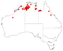 It is native to an area in the Northern Territory and the Kimberley region of Western Australia.[3] The range of the plant extends around south of Kununurra in the Carr Boyd Range in the eastern Kimberley as well as in the Victoria River district in the top end of the Northern Territory where it is commonly situated on and around sandstone escarpments or ridges as a part of open Eucalyptus or Terminalia woodland communities.[1]