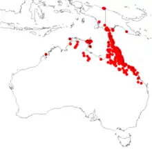 In the Territory, it is found in the bioregions Arnhem Coast, Cape York Peninsula, Einasleigh Uplands, Gulf Fall and Uplands, Gulf Plains, Northern Kimberley, Pine Creek, Tiwi Cobourg, and Wet Tropics.