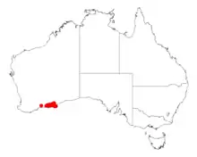 It is native to a small area along the south coast in the Goldfields-Esperance region of Western Australia just inland from Esperance where it is commonly situated on hilltops, limestone rises, plains and along the edges of salt lakes growing in sandy or clay or calcareous loamy soils.[1] The bulk of the population is found between Scaddan in the west to around Mount Ragged in the Cape Arid National Park to the east usually as a part of shrub mallee or low Eucalyptus woodland communities.[2]