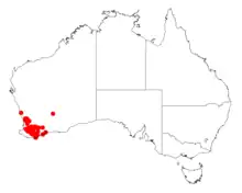 It is native to an area in the Wheatbelt, Great Southern and South West regions of Western Australia where it mostly grows in gravelly lateritic soils.[1] The bulk of the population is found from around Bindoon in the north west down to around Mount Barker extending to around Fitzgerald River National Park in the south east and up to around Newdegate in the north east growing in a variety of habitats in sandy to loamy laterite based soils as a part of Eucalyptus woodland, heath or scrubland communities.[2]