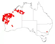 It has a scattered distribution in the Kimberley, Pilbara, Mid West and Goldfields-Esperance regions of Western Australia extending into western parts of the Northern Territory where it is often found on alluvial flats, in depressions, on stony plains and along watercourses growing in rocky sand, clay or loam soils around areas of limestone or quartz.[2]