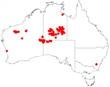 It is native to an area in the desert in the Central Ranges of the eastern Goldfields region of Western Australia growing in red sand, stony sand, loamy or clay soils.[2] The shrub is also found in north western South Australia and southern parts of the Northern Territory. The range of the species extends from as far west as Warburton in the Blackstone and Cavenagh and Blackstone Ranges to the north western margins of the Simpson Desert in the Northern Territory in the north down to around the Musgrave and Tomkinson Ranges of South Australia where it is situated along dry creeks and river beds.[1]