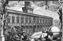 Various changes and additions were made to the two-story Palazzo Poggi to accommodate the needs of the institute.[5] The Astronomical Observatory Tower (Specola) was built in 1725 to a design by Carlo Francesco Dotti.[10] Laboratories, galleries and workshops were set up, and the institute became a research facility as well as a venue for exchanging information.[5] In 1727 Marsigli transferred his collection of materials from the Dutch East and West Indies to the institute.[9] The institute published its first volume of Proceedings in 1731, three volumes between 1745 and 1747, and five more volumes before the end of the eighteenth century.[11] The institute helped pull Bologna out of its provincial isolation, reengaging with centers such as the French Academy of Sciences and the British Royal Society.[12]