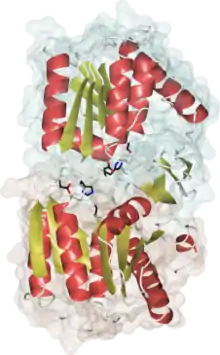 ![]() Crystal structure of human APT1, PDB code 1fj2. Alpha helices are in red, beta strands in gold, catalytic site residues in black. The 2 different monomers of the dimer are shaded in green and brown. | |||||||||
