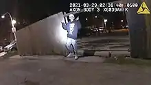 Body cam footage of Toledo's shooting, released on April 15, 2021, showed that Toledo was unarmed at the moment he was shot.[48][49][50] The video shows officer Stillman chasing Toledo into the alleyway and yelling at him to stop.[48][51] Toledo slows down and stops as Stillman catches up to him.[48][51] In footage taken from another angle, Toledo appears to throw a pistol behind a fence just before turning to face the officer (body cam footage shows a pistol being recovered behind the fence two minutes after the shooting).[48][49] Stillman yells "Show me your fucking hands" and "drop it" while flashing a strobe flashlight at him.[48] Toledo turns around with his empty hands in the air, and Stillman then shoots Toledo as he does so.[48][49]