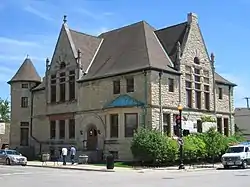 The building is found at the southeast corner of Wesley and Main Streets in Wheaton. It stands two stories tall and was built with coursed limestone and Bedford stone trimmings in the Richardsonian Romanesque style. The style is characterized by rough-hewn stone blocks, emphasized horizontal lines, wide rounded arches, and intricate ornamentation. The work is nearly identical to a library that Frost designed in Morgan Park, Chicago the previous year. Each facade has a tall stone gable with pinnacles on either side near the base. Gable eaves have dentil moldings carved into a leaf motif. Each gable has an arched window. The north gable is capped with a decorative urn. The north facade features a turreted stair tower on the east side. It also has a double doorway, the main entrance, and a bay window on the west side of the first floor. The entrance is arched with a Bedford stone egg-and-dart voussoir. An inner arch is ornamented with a leaf design. The south facade has a bay window that looks out onto a small courtyard.