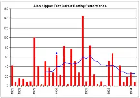 Kippax was an "impeccably correct and elegant batsman, [with] an upright, easy stance at the wicket; like his schoolboy idol Victor Trumper, he rolled his sleeves between wrist and elbow and excelled with the late cut",[1] who was probably at his peak during the 1920s.[2] His omission from the 1926 team to tour England caused great controversy at the time—especially as he hit a brilliant 271 not out against Victoria on the eve of selection. Kippax was well into his thirties by the time he became a consistent selection for the Test team. Highly regarded by both fellow players and spectators, Kippax's innings of 83 in the Lord's Test of 1930 induced Neville Cardus to comment that, "he pleased the eye of the connoisseur all the time."[3]
