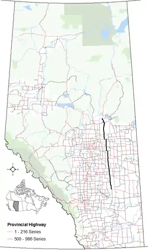 Alberta Provincial Highway No. 855[2] is a highway in the province of Alberta, Canada. It runs south-north from Highway 9 west of Hanna to Highway 55 and Highway 63 in Atmore. It provides access to rural areas, and is gravel at both its south and north ends. At 389 km (242 mi) it is the longest 500-986 series highway in Alberta.