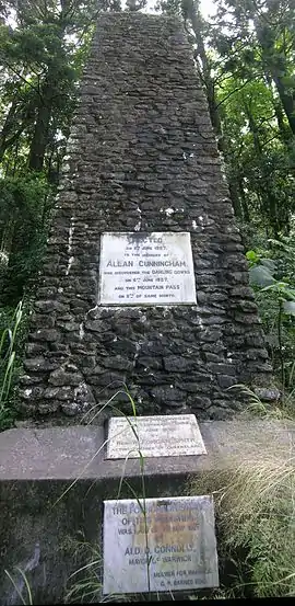 Cunningham returned to the Moreton Bay penal colony in 1828, setting off from Brisbane with Patrick Logan, Charles Fraser and five men to find Mount Warning and to establish the route to Cunningham's Gap which he did, on 24 July.[4] The peaks on either side of the gap were also named, Mount Cordeaux and Mount Mitchell. After exploring the McPherson Range area, Cunningham travelled on the south side of the Gap whereas the highway today runs further north, through the gap, from the small township of Aratula. Spicer's Gap which runs parallel to Cunningham's Gap was actually the pass first identified by Cunningham in 1827.[10] After its rediscovery by Henry Alphen in 1847, Spicer's Gap was used as a stagecoach route. In 1829, Cunningham explored the Brisbane River.