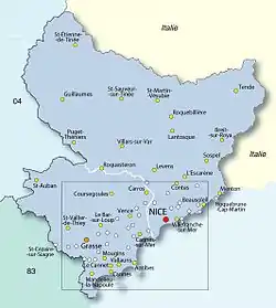 Alpes-Maritimes (French: [alp(ə)maʁitim]; Occitan: Aups Maritims; Italian: Alpi Marittime, "Maritime Alps") is a department of France located in the country's southeast corner, on the Italian border and Mediterranean coast. Part of the Provence-Alpes-Côte d'Azur region, it encompasses the French Riviera alongside neighbouring Var. Alpes-Maritimes had a population of 1,094,283 in 2019.[3] Its prefecture (and largest city) is Nice, with Grasse as the sole subprefecture.