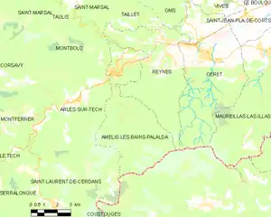 Amélie-les-Bains-Palalda is located in the canton of Le Canigou and in the arrondissement of Céret. It sits at the confluence of the Mondony with the Tech, 28.5 miles (46 km) SSW of Perpignan by road. The town is situated at a height of 770 feet (230 m) and has both a winter and summer season.[4]