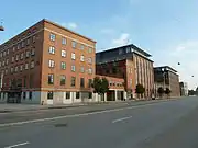 Amerika Plads (lit. "America Square") is a public square and surrounding neighbourhood in the Østerbro district of Copenhagen, Denmark. It is the result of a redevelopment of an area in the southern part of the former Freeport of Copenhagen into a mixed-use neighbourhood which consists of dwellings, offices and retail establishments, combining converted historic buildings and modern architecture. The former Free Port Station building was put in storage during the redevelopment and is now located in the middle of the square where it serves as a café. The area is to the west bounded by Kalkbrænderihavnsgade, part of a major thoroughfare, and to the east by Dampfærgevej connected to Kalkbrænderihavnsgade in both ends and separating Amerika Plads from America Quay, the western quay of the Southern Free Port dock. The name of the area, like that of the quay, is a reference to the Amerikabåten, large passenger ships which used to transport Danish emigrants to New York City during the first half of the 20th century.