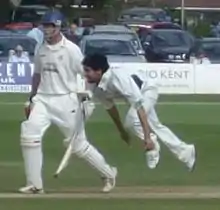 Khan was brought to the attention of Kent County Cricket Club by Ole Mortensen, a friend and former teammate of Kent coach John Wright.[7] In his first full season at Kent County Cricket Club, in 2002, he claimed 63 wickets. He failed to regain his form for the next two seasons, taking a combined total of 31 wickets.