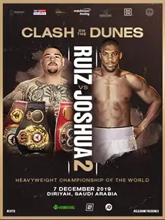 Andy Ruiz Jr. vs Anthony Joshua II, billed as Clash On The Dunes, was a heavyweight professional boxing rematch between the Mexican-American champion Andy Ruiz Jr. and British former champion Anthony Joshua, for the unified WBA (Super), IBF, WBO and IBO heavyweight world titles. The event took place on December 7, 2019, at the Diriyah Arena, Diriyah, Saudi Arabia. Joshua won the bout via unanimous decision.[1][2] The bout between Ruiz and Joshua was refereed by Luis Pabon.[3]