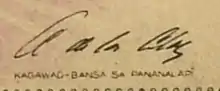 Antonio de las Alas was an acting Secretary of the Interior, four-term representative of the 1st district of Batangas in the Philippine Legislature, Secretary of Public Works and Communications,[4] a member of the Senate of the Philippines[5] during World War II, and a member of the constitutional convention delegation in 1934 and 1971.[1][2][6][7] His signature is on an unissued 100-peso banknote dated 1944.[8] After the war, he worked in many Filipino companies and institutions.[1][2] In 1978, he received an Alumni service award. He died at the age of 94 in Illinois in 1983.[9]