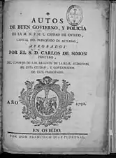 - HISTORICAL FUND or LIBRARY of the CPMHA. It constitutes an own section, and it is known as the Library of the Commission. It is formed by near 3.500 registers, gathered from 1844 to 1952 which answer to the interests of the institution, in a determinate period and by those who were at the top of the shopping and acquisitions (Ciriaco Miguel Vigil, Fermín Canella, Fortunato de Selgas, Rafael Altamira, etc.). It predominates the following matters: epigraphy, numismatist, antiquities, classical archaeology, history of art, medals, ivories, fine arts, Asturian subjects, etc. The majority were printed between 1870 and 1930 and the origin is diverse. it entered by purchase, by donation of its author or possessor and by exchange between history institutions, local studies or of provincial museums. There are French editions of art encyclopedias, of classical art, antiquities, editions on the first archaeologic excavations in the 19th century, and the main works of the 19th century in matter of prehistory and archaeology. It conserves an extraordinary work: Architectural Monuments of Spain, considered the most ambitious project from the bibliographic point of view of ones tackled in Spain. This work was printed to study and spread the artistical heritage of the country, specially the Asturian. It was published under the direction of a special commission created by the Ministerio de Fomento, between 1856 and 1881. In its graphic part it was employed with big precision the technics of the intaglio, the lithography and the cromolitografía. Also it stands out factitious editions that gather documents and varied brochures, grouped by subjects of interest: Subjects of Asturias, political Writings, History, etc. There are documents of interest written in Asturian language, that allowed the study of this language: loose leaves, poems and manuscripts. And also handwritten texts, speeches, sermons, letters, and historical documentation. Other curious materials that integrate the collection of the library are ephemeral and difficult to achieve materials like brochures, small format publications, posters, loose leaves, etc.[4]