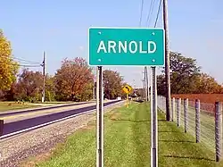 In 1893, a railroad station was built and a community platted on land owned by Mrs. George Arnold along the Toledo and Ohio Central Railroad. The station was originally called New California, but the name was changed when they applied for a post office.[4] The Arnold Post office was established on June 21, 1894, with James Arnold as the original Postmaster.[5] Arnold closed his grocery store, and the post office was abandoned in 1896. Fred Smith was then commissioned as Postmaster, but closed his business also before he could perform any of the duties of the office. Mrs. Carrie Fleck was the next Postmaster, when she and her husband established a store in the community later in 1896. She continued her duties until the branch was discontinued on February 28, 1910.[4][5] As of 1913, Mr. & Mrs. Fleck's store had continued to grow, and there was also another grocery store, an axe handle factory, two warehouses, the railroad station, 24 houses, and a population of about 100.[4]