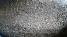 Ashoka the great expounded his policy of Dhamma through his edicts.[22] By engraving his views about Dhamma on these edicts, Ashoka tried to directly communicate with his subjects.[23] These inscriptions were written in different years of his life.[24] The inscriptions can be divided into two categories. A small group of inscriptions reveal that the king was a follower of Buddhism and were addresses to the Buddhist church—the Sangha. These inscriptions are declarations of Ashoka's relationship with the Buddhist order.[25] Inscriptions of the other category are known as the Major and Minor Rock Edicts, which were inscribed on rock surfaces. This larger group includes the Pillar Edicts inscribed on specially erected pillars.[26][27]