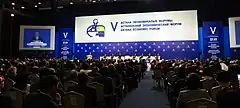 The Astana Economic Forum (AEF) is an international and regional platform for dialogue and a nonprofit organization headquartered in Nur-Sultan, Kazakhstan. It was organized by the Eurasian Economic Club of Scientists Association and the Government of Kazakhstan in 2008.[1][2] After a decade the forum is taking on an additional name – The Global Challenges Summit – to reflect the topics and draw of attendees from around the world.[3] Since 2015 the Forum is organized by the Economic Initiatives Fund of Kazakhstan, which is a part of the Economic Research Institute under the Ministry of National Economy. A meeting is held each year in Nur-Sultan in which more than eight thousand delegates from one hundred countries are brought together: They include chief executive officers of businesses, politicians, journalists, scientists and Nobel Prize laureates.[4]