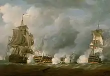 With his enemy visible from the deck of his flagship by 06:30, Howe recalled his frigates and ordered his fleet to press on all sail in the hope of engaging the rear of the scattered French line.[12] By 10:35 Howe's continued pursuit was making his own battleline ragged, but he pressed on in the belief that Villaret intended to use the weather gage to outrun him and escape. To counter this, Howe ordered his fastest ships into a flying squadron under Admiral Thomas Pasley.[15] This squadron was significantly faster than the majority of the vessels in either fleet and rapidly closed with the French rear. The first shots of the engagement were fired at 14:30 by HMS Russell, commanded by John Willett Payne, which managed some long-distance fire at the rearmost French ships on the opposite tack. Fire was returned by the French but without significant effect.[16] In an attempt to hold off Pasley's squadron, at 17:00 the French first rate 110-gun Révolutionnaire exchanged places with the smaller third rates at the rear of the line and engaged the pursuing British van.[3] This manoeuvre was apparently conducted on the initiative of Captain Vandangel of Révolutionnaire without orders from Admiral Villaret or his political observer Jean Bon Saint-André.[17]